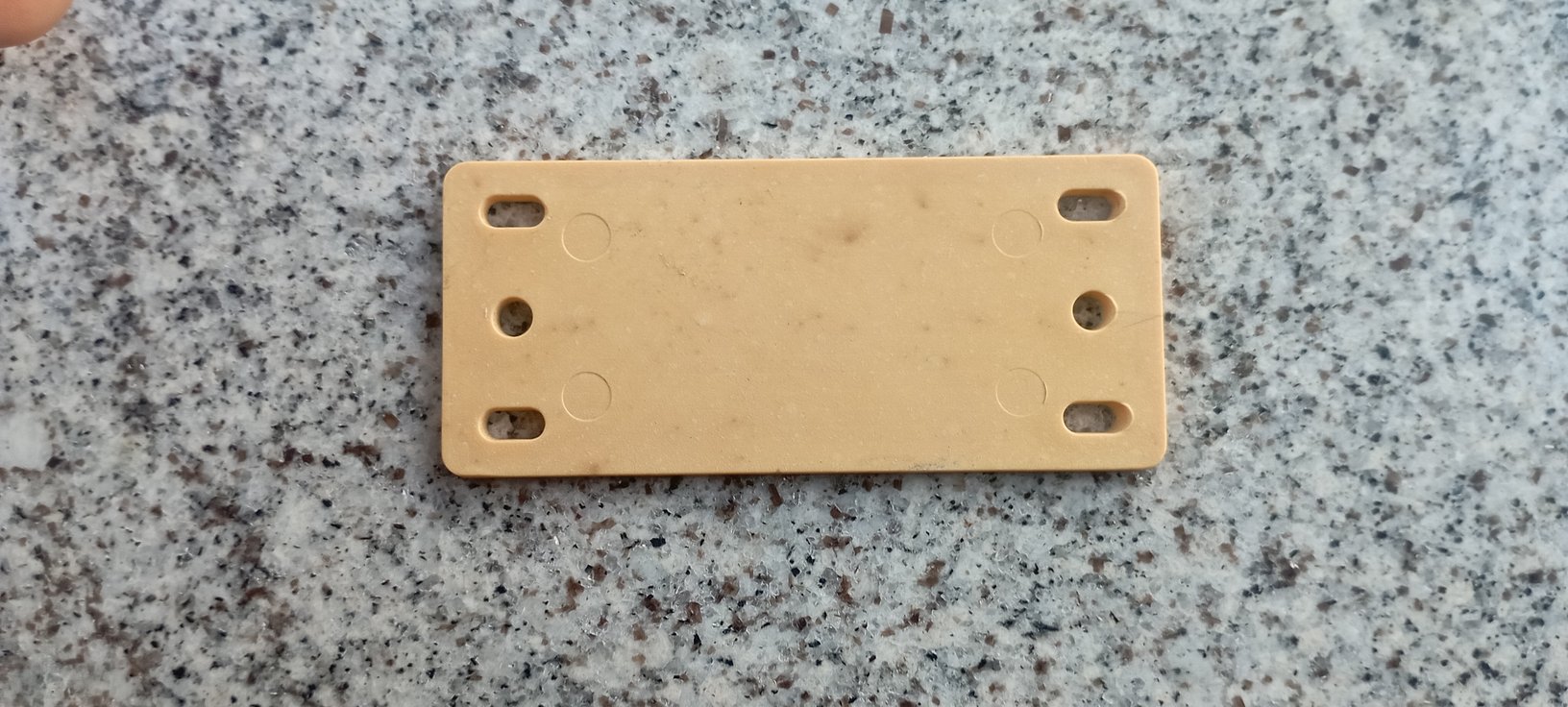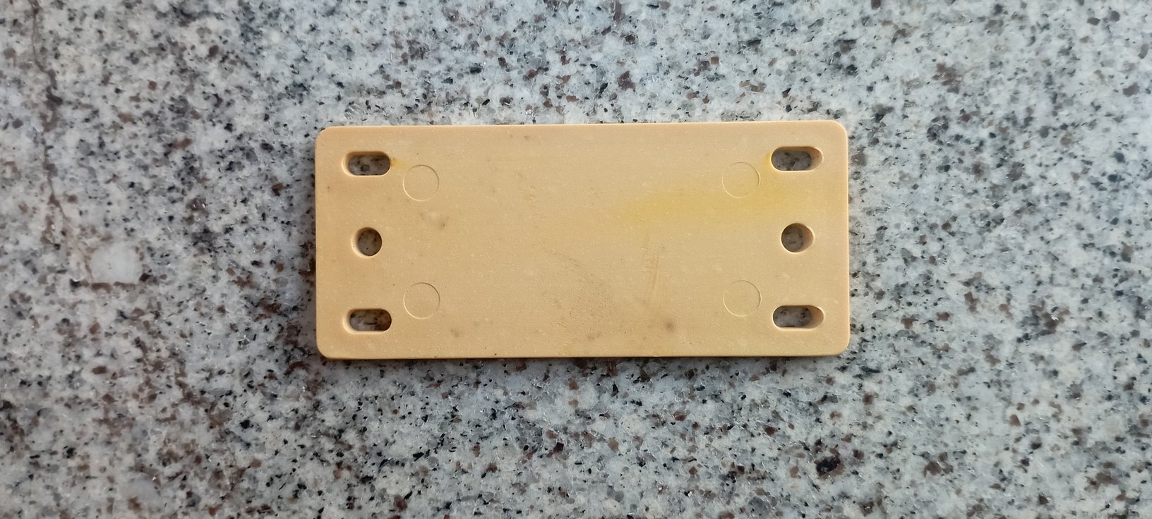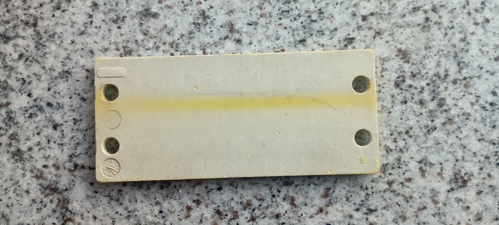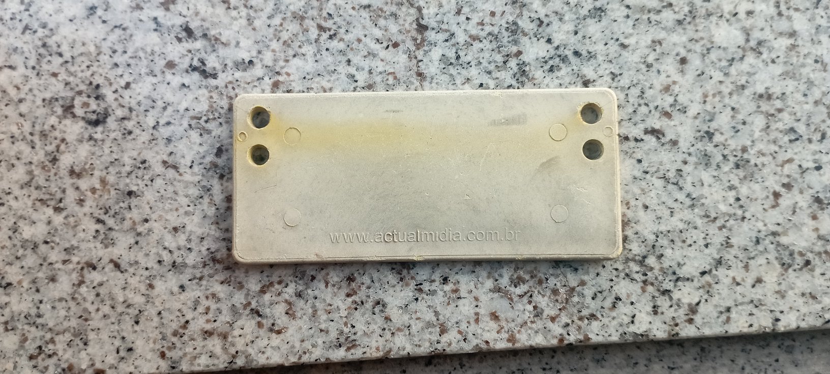 A plaqueta mostrada na Figura 4 tem uma textura específica, um áspero idêntico aos copos de plástico velhos da casa da minha avó, trazidos pelas minhas tias que trabalhavam como professoras em escolas públicas. As rachaduras fazem parecer que essa está prestes a se despedaçar, claramente dobrada pelo estresse dos fios que a amarravam ao cabo que ela identificava. Mas ela permanece inteira: suas feridas são apenas visuais, cicatrizes marcantes para quem vê de fora — mas aquele que é íntimo sabe que são nada em comparação à sua força.