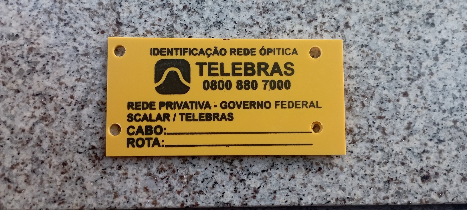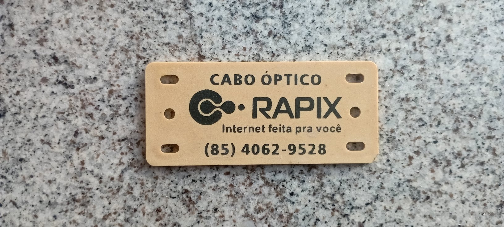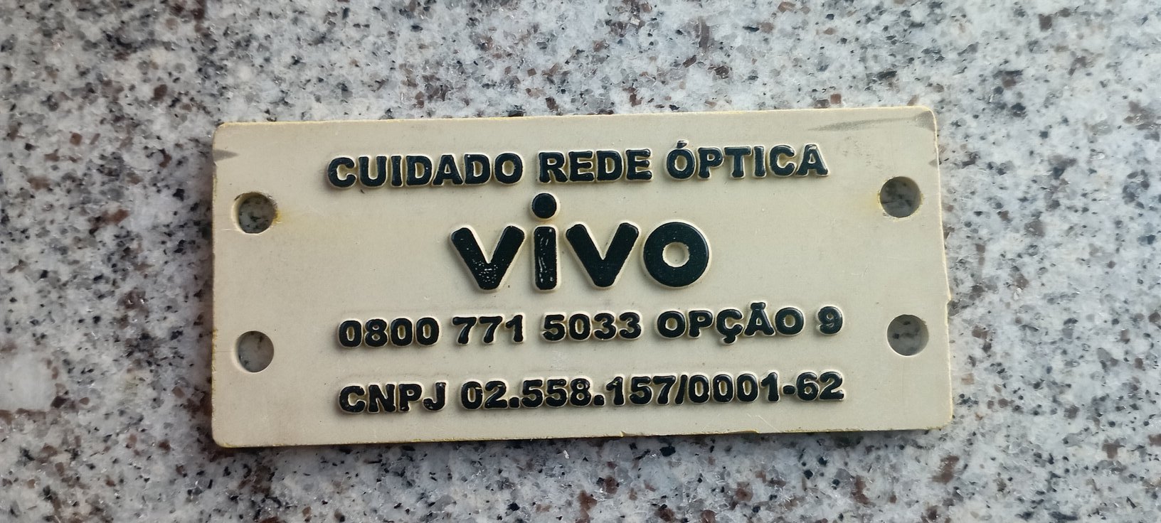 São pequenas placas retangulares identificadoras, feitas de algum plástico barato, que são amarradas a postes. Normalmente possuem o nome da empresa2 e outras informações bacanas (sei que existem plaquetas do mesmo formato para outros tipos de cabos, mas meu ramo são plaquetas identificadoras de cabo óptico). Essas plaquetas estão em todo lugar na avenida! Na verdade, em quase todo lugar: a possibilidade de você, agora, sair de casa e olhar para o poste mais próximo e ver várias destas é bem alta.