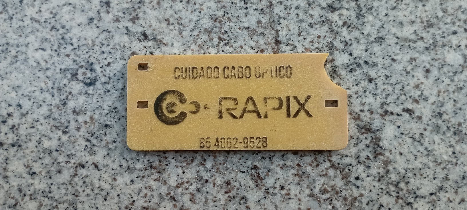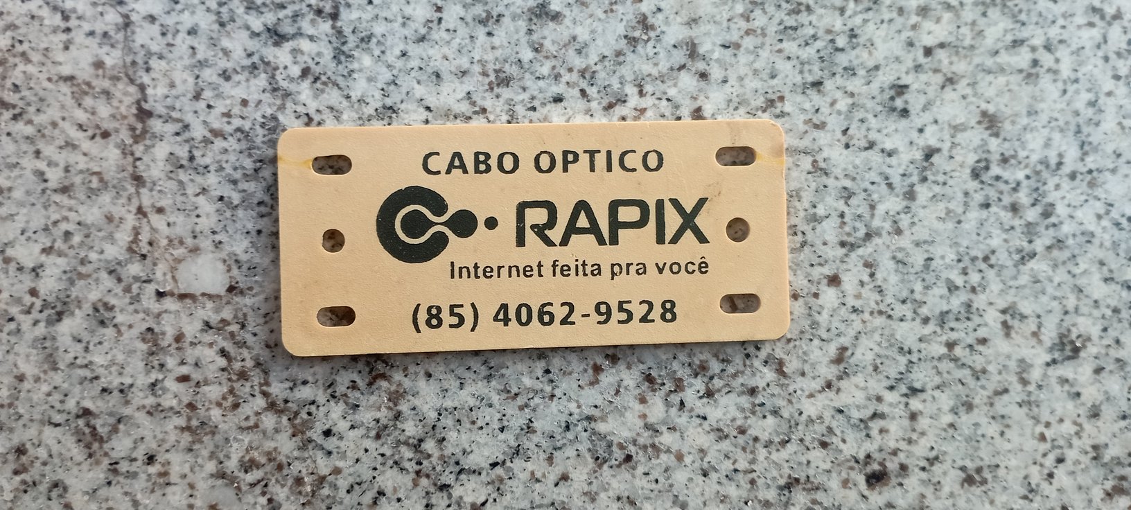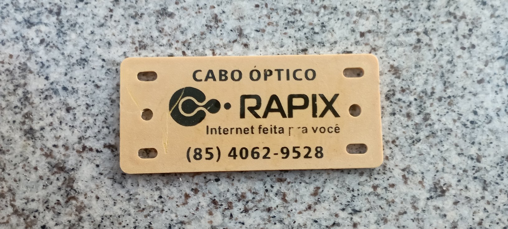 São pequenas placas retangulares identificadoras, feitas de algum plástico barato, que são amarradas a postes. Normalmente possuem o nome da empresa2 e outras informações bacanas (sei que existem plaquetas do mesmo formato para outros tipos de cabos, mas meu ramo são plaquetas identificadoras de cabo óptico). Essas plaquetas estão em todo lugar na avenida! Na verdade, em quase todo lugar: a possibilidade de você, agora, sair de casa e olhar para o poste mais próximo e ver várias destas é bem alta.