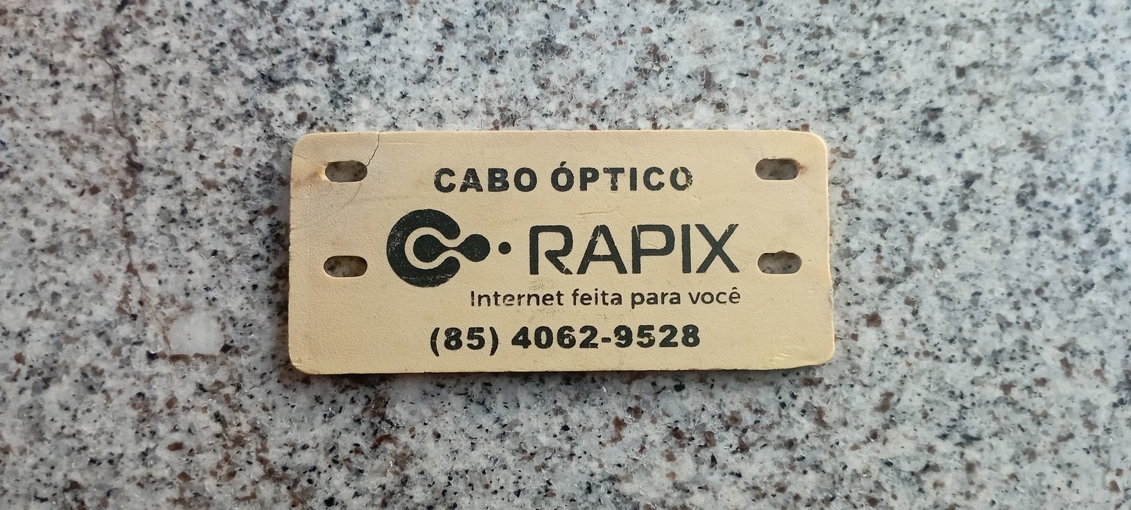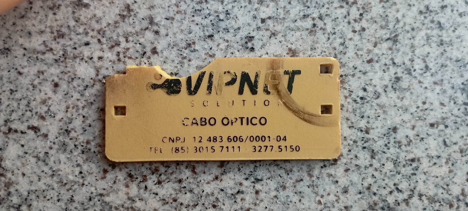 Numa ida ou vinda qualquer, no meio do lixo que permeia a calçada, encontrei uma pequena plaquinha. Essa plaquinha era bege-alaranjada e tinha uma qualidade totalmente diferente das outras sacolas, embalagens e caixas de papelão, parecendo brilhar em meio à grama. Como qualquer bom coletor (de relíquias com coração de bibliotecário-arquivador), coloquei a pequena plaquinha no meu bolso e segui caminho. Daqui em diante, eu descobri meu novo passatempo: coletar plaquetas de identificação de cabo óptico!